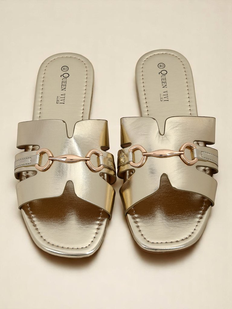 - Pantofle z ekologické kůže, zdobené jemným zlatým ornamentem. Elegantní jednoduchost a pohodlí, vhodné k jakémukoli letnímu outfitu.