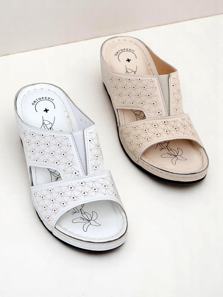 Sandali Ortopedica jsou dámské ortopedické pantofle, které kombinují nadčasový styl s inovativní péčí o zdraví vašich nohou. Svršek je vyroben z nejkvalitnější přírodní kůže s precizními laserovými perforacemi, které vytvářejí elegantní geometrický vzor inspirovaný středomořskými motivy. Kůže pochází z certifikovaných evropských koželužen, díky čemuž jsou pantofle bezpečné pro alergiky a mimořádně odolné.Ortopedická vložka je vyrobena z paměťové pěny, která si pamatuje anatomický tvar chodidla a zajišťuje maximální komfort používání po celý den. Jemná podšívka z mikrovlákna zajišťuje dokonalou cirkulaci vzduchu, zabraňuje přehřívání nohou a nepříjemným pachům.Pantofle Sandali Ortopedica jsou lehké a vybavené protiskluzovou podrážkou z pružného materiálu EVA, která tlumí každý krok. Výška klínku byla navržena tak, aby ulevila páteři, kloubům a zlepšila držení těla při chůzi.Vlastnosti a výhody:- Snižují únavu nohou- Zlepšují krevní oběh díky ergonomickému profilování- Ideální pro osoby s plochýma nohama nebo bolestmi nohouNápady na stylizace:1. Ležérní styl: Kombinujte s lněnými kalhotami a jednoduchou, světlou košilí – ideální pro každodenní nákupy nebo procházku po městě.2. Pohodlí do práce: Slaďte se sakem a látkovými culottes pro pohodlí a zachování profesionálního vzhledu.3. Víkendová pohoda: Pantofle se skvěle hodí k letním květovaným šatům nebo bavlněným šortkám.Konzervace a péče: Skladujte pantofle na suchém, větraném místě. Čistěte vlhkým hadříkem a používejte speciální prostředky na přírodní kůži. Není vhodné prát v pračce. Chraňte před nadměrným slunečním zářením.Sandali Ortopedica jsou skvělou volbou pro sezónu jaro-léto – jednoduché, světlé pantofle jsou must-have v šatníku každé ženy, která si cení pohodlí a klasické elegance v souladu s aktuálními trendy funkční a zdravé obuvi.