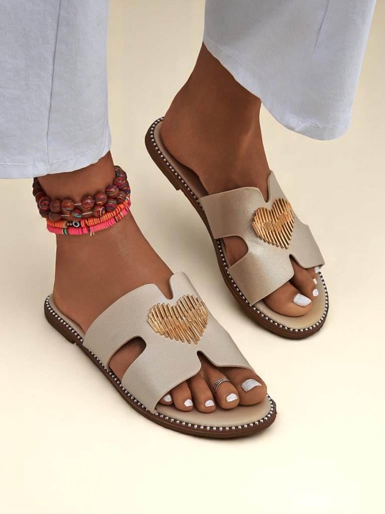 - Žabky z eko kůže s plochou podrážkou a zlatou ozdobou ve tvaru srdce. Styl a pohodlí v jednom – ideální pro léto, procházky po městě a lehké, ženské stylizace.