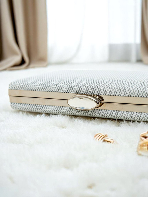 - Psaníčková kabelka vyrobená z eko kůže s třpytivou nití a jemným reliéfem. Zapínání na patent, s odnímatelným řetízkem – ideální na večerní vycházky a elegantní příležitosti.