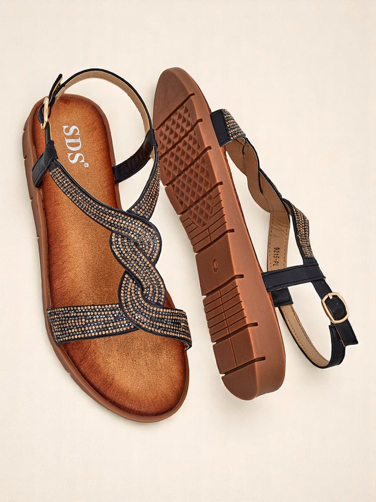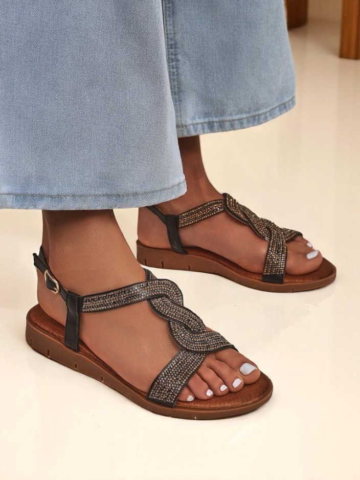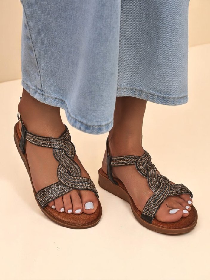 • Dámské ploché sandály z eko kůže, zdobené zirkony. Lehké, pohodlné a elegantní – ideální na léto, každodenní nošení a letní večery s nádechem lesku.