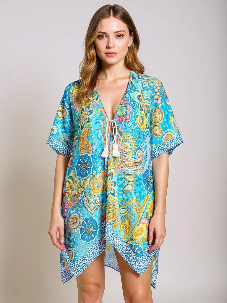 - Letní plážová tunika typu pareo s véčkovým výstřihem a asymetrickým lemem je stylový must-have na dovolenou. Vzdušná, lehká tkanina a efektní vzor podtrhují ženskost a volný střih zajišťuje komfort v horkých dnech. Ideální na pláž i letní procházky.