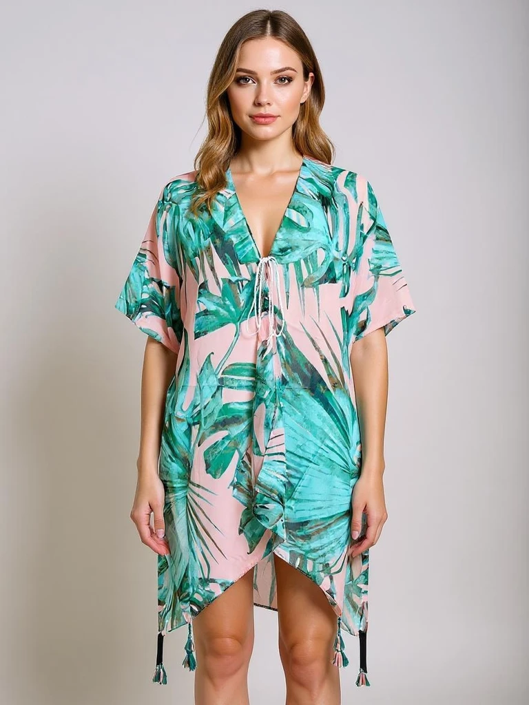 - Letní plážová tunika typu pareo s véčkovým výstřihem a asymetrickým lemem je stylový must-have na dovolenou. Vzdušná, lehká tkanina a efektní vzor podtrhují ženskost a volný střih zajišťuje komfort v horkých dnech. Ideální na pláž i letní procházky.