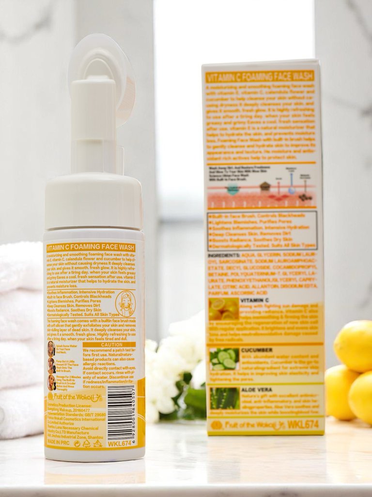 - Čisticí pěna na obličej s vitamínem C a kartáčkem. Jemně odstraňuje nečistoty, rozzáří pleť a má omlazující účinky, zanechává pleť svěží, hladkou a zářivou.