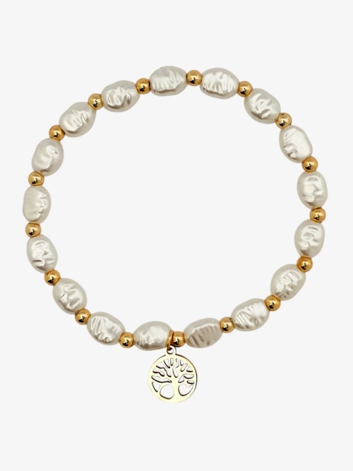 - Jemný dámský náramek na elastickém pásku, ozdobený perlami a korálky. Jeho půvab umocňuje krásný přívěsek, který nenápadně poutá pozornost. Skvěle se hodí jak k elegantním, tak i každodenním outfitům s nádechem třídy.