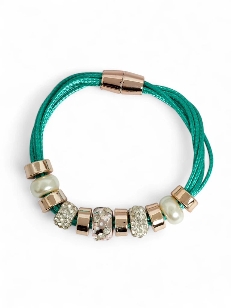 - Efektní dámský náramek na šňůrkách s magnetickým zapínáním. Zdobený stříbrnými korálky se zirkony, které se krásně třpytí ve světle. Stylový doplněk pro každodenní i večerní stylizace.