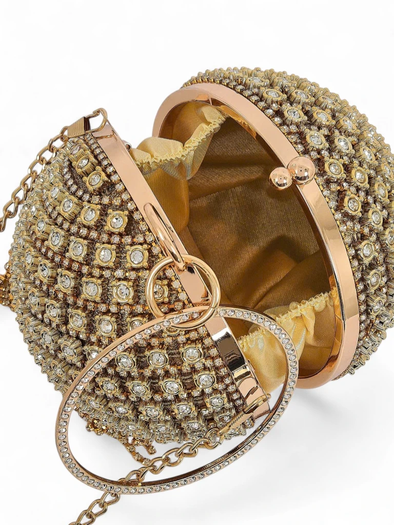 - Kulovitá kabelka psaníčko s lesklými zirkony a elegantním řetízkem přes rameno. Ideální pro večerní vycházky – přitahuje pohledy a doplňuje každý outfit.