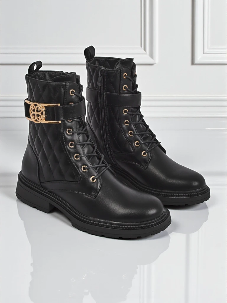 Černé kotníkové boty s prošívaným svrškem a zlatými detaily jsou hitem aktuálních kolekcí – podtrhují individuální styl a spojují pohodlí s luxusním vzhledem. Jsou nepostradatelnou součástí šatníku pro každou moderní ženu, která si cení módy a komfortu.