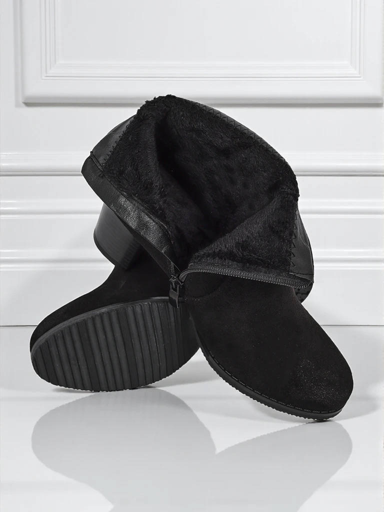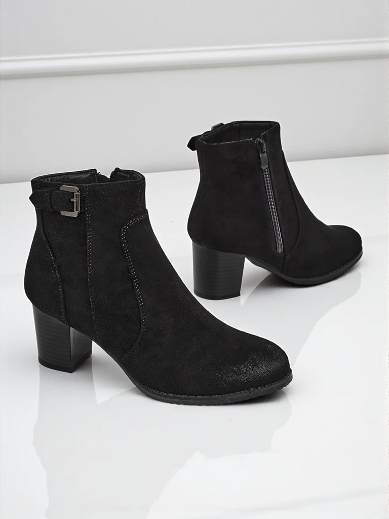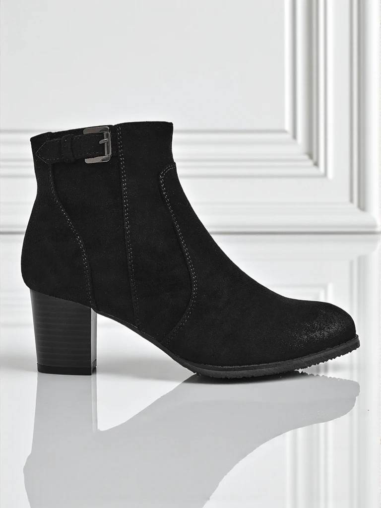 • Rewelacyjní dámské kotníkové boty na podpatku, vyrobené z eko semišové kůže. Vnitřek je vyroben z jemného kožíšku. Model se zapíná na zip. Mají ozdobné přezky. Ideální pro podzimní kreace!