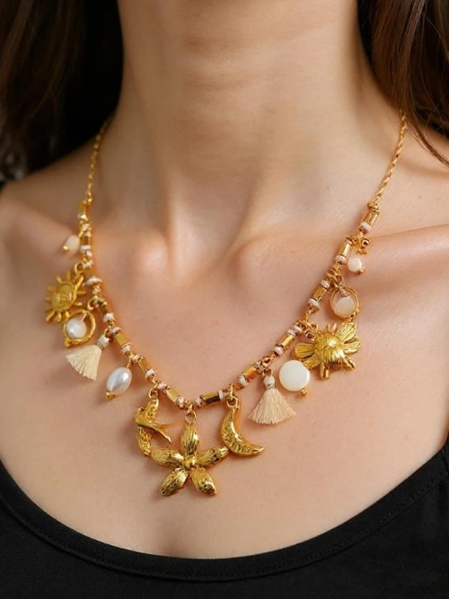 - Náhrdelník Aurora Floralis s přívěsky a perlami je jedinečný šperk v boho stylu, ideální pro každou příležitost.