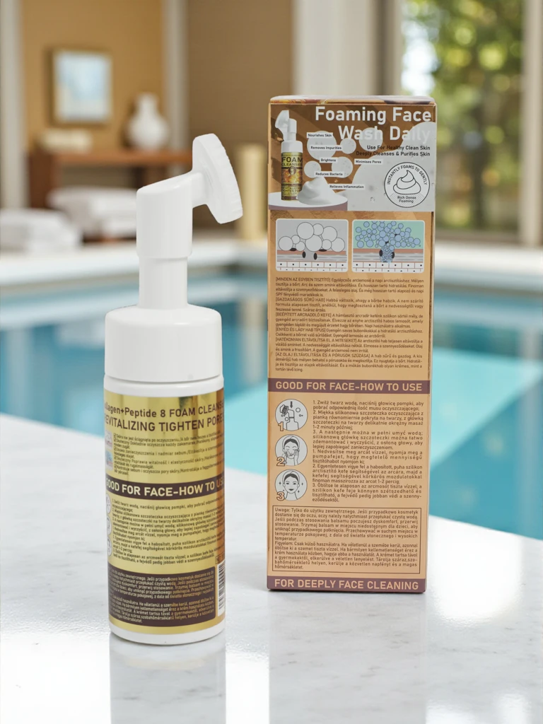 - Složení kosmetiky: hydrolyzovaný kolagen (Hydrolyzed Collagen) + komplex Peptide‑8, humektanty (např. glycerin), jemné surfaktanty na bázi glykosidů (např. coco‑glucoside), zklidňující rostlinné extrakty. Složení vyvinuto tak, aby vytvářelo krémově‑hustou pěnu bez vysušování pleti.