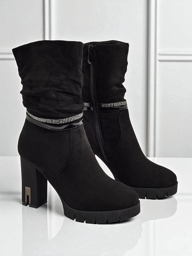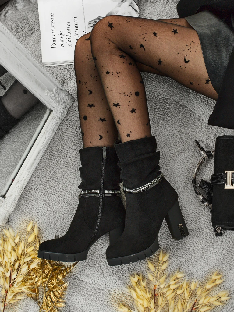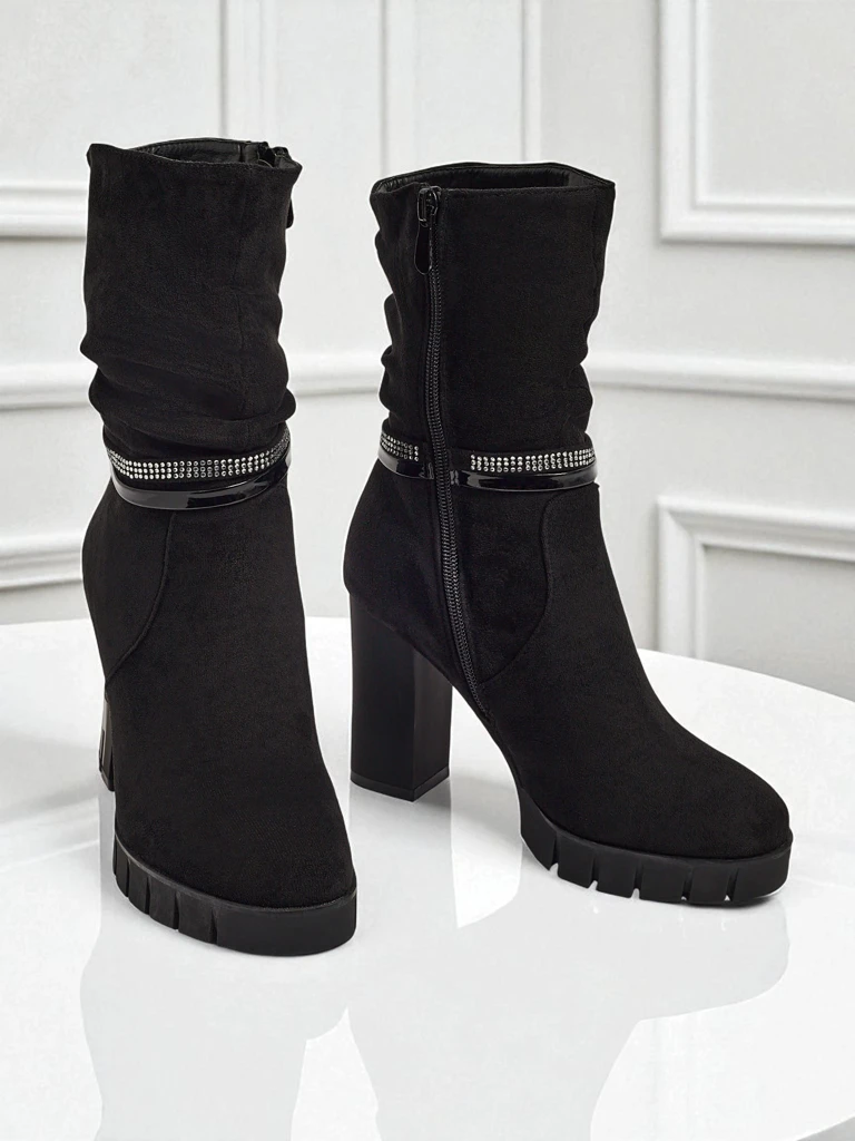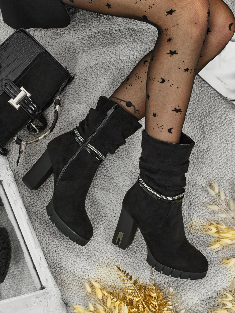 - Pohodlné kotníkové boty na sloupku, vyrobené z eko semišové kůže. Model se zapíná na zip. Mají ozdobný pásek s kamínky.