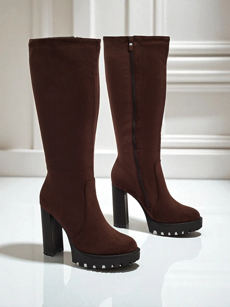 - Stylové dámské kozačky po kolena na sloupku. Svršek je vyroben z eko semišové kůže, uvnitř je zateplení ve formě kožešiny. Model se zapíná na zip. Ideální pro každodenní podzimní outfity!