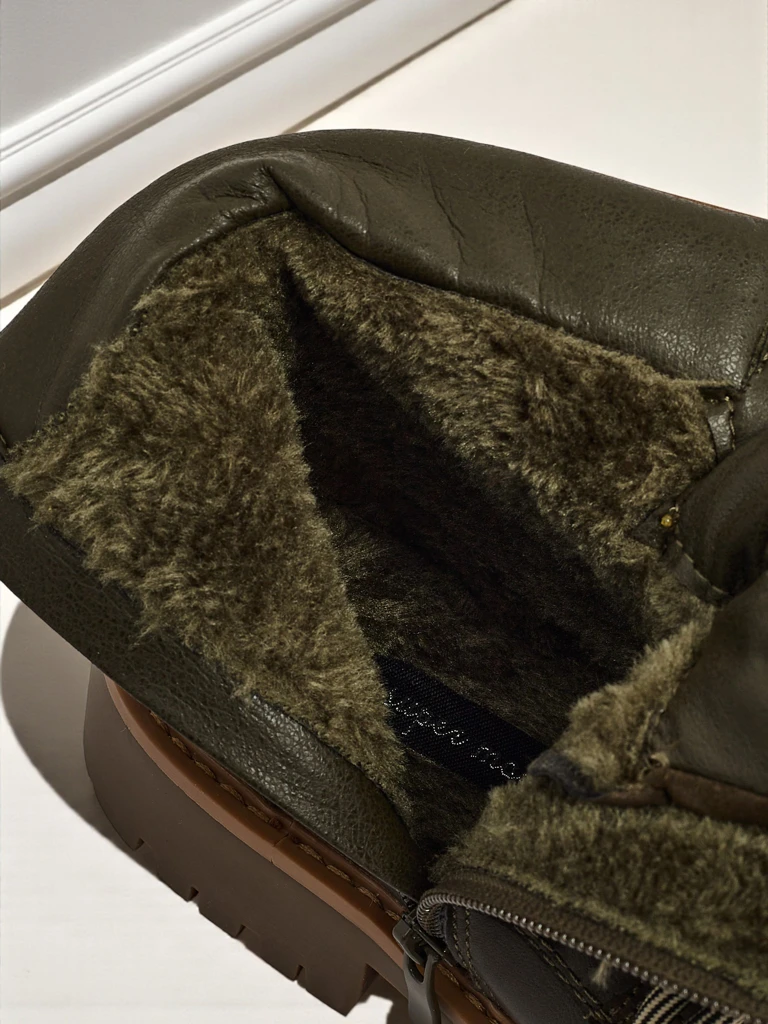 • Dámské trekové boty typu traper s šněrovacím svrškem a bočním zipem. Vyrobeny z ekologické kůže. Vnitřek bot je zateplený kožešinou. Ideální pro zimní období!