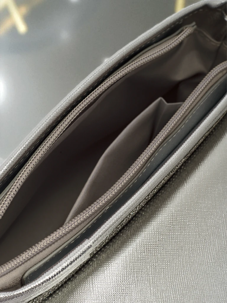 - Elegantní psaníčko s lesklými zirkony, 1 komora, uzavíratelné na zip. Stylová ucha a ozdobný řetízek dodávají šmrnc. Ideální pro výjimečné příležitosti – oslňte s grácií!