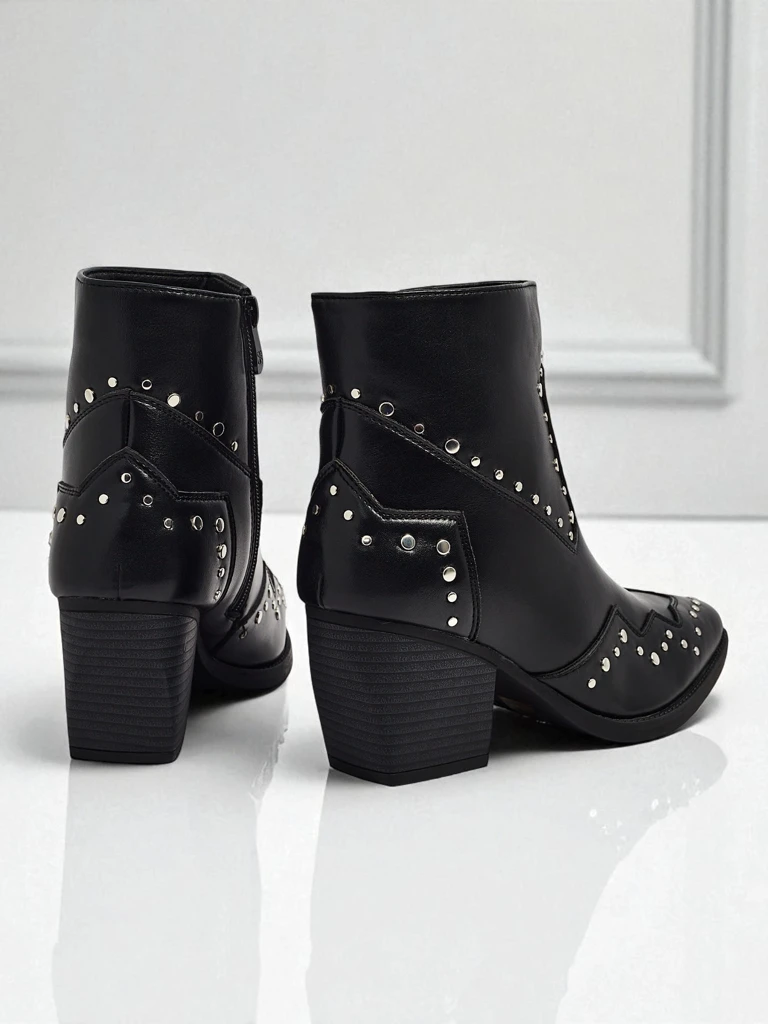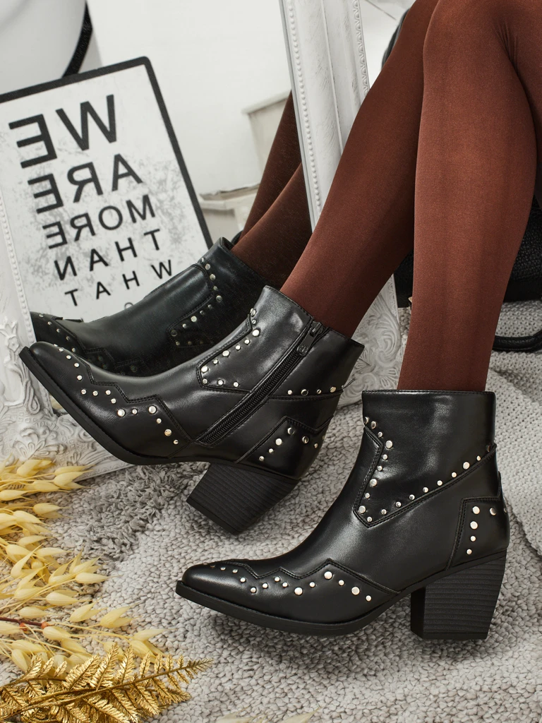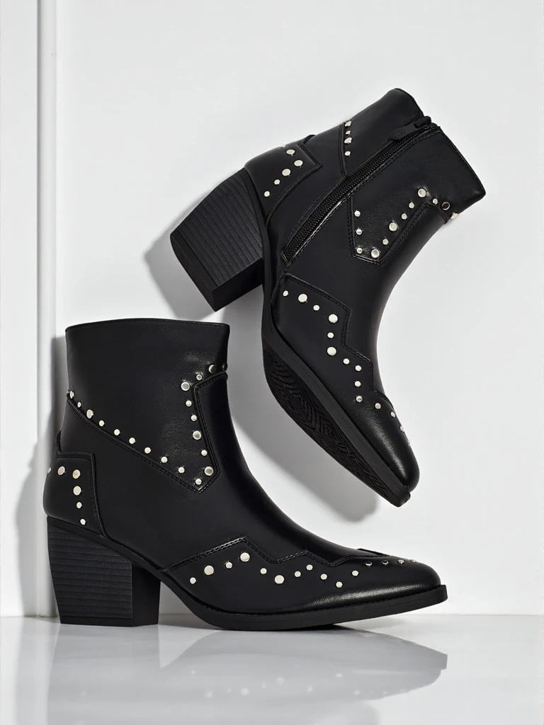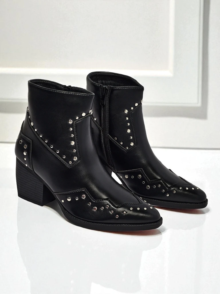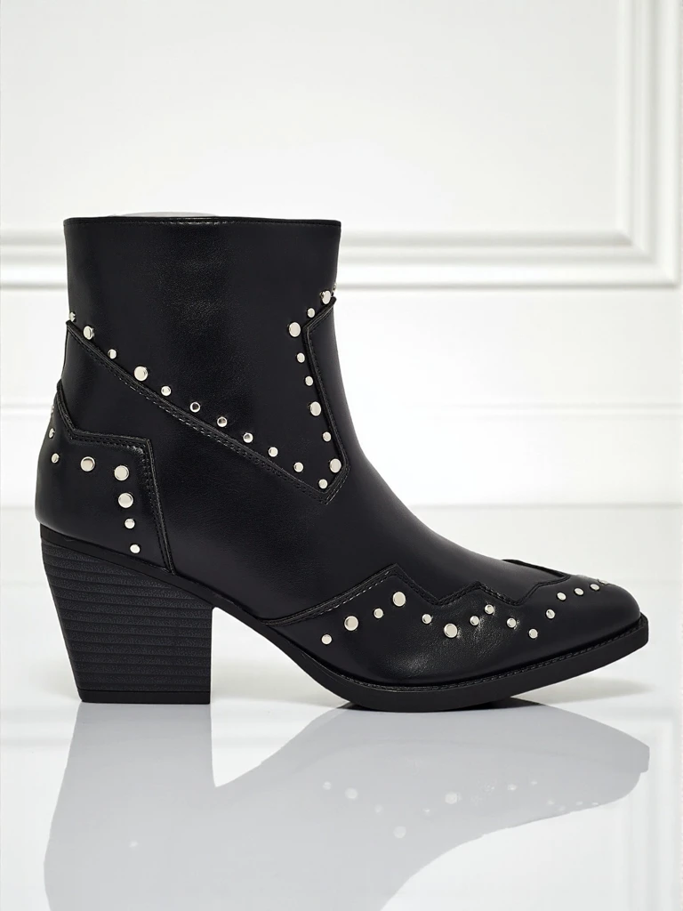- Kotníkové boty ve stylu kovbojek na podpatku, vyrobené z ekologické kůže. Vložka z eko kůže, boty se zapínají na zip s ozdobnými cvočky. Hodí se k mnoha ženským stylizacím!