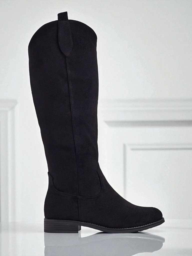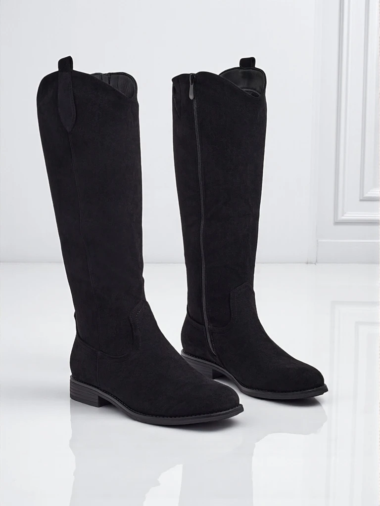 - Stylové dámské kozačky po kolena na ploché podrážce. Svršek je vyroben z eko semišové kůže, uvnitř je oteplení ve formě kožešiny. Model se zapíná na zip. Ideální pro každodenní podzimní outfity!