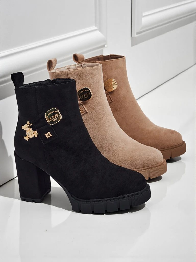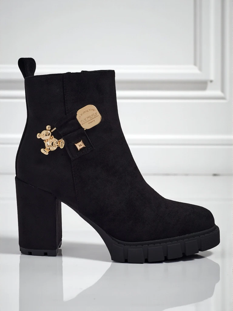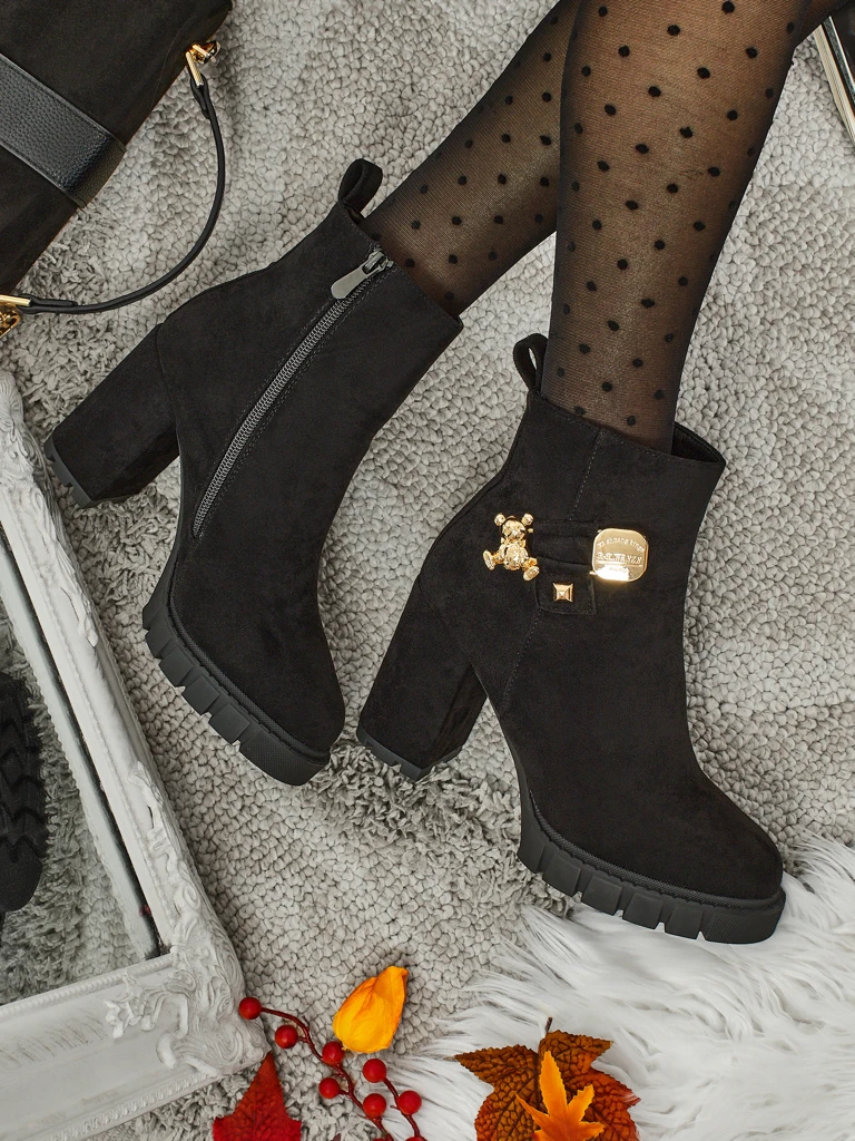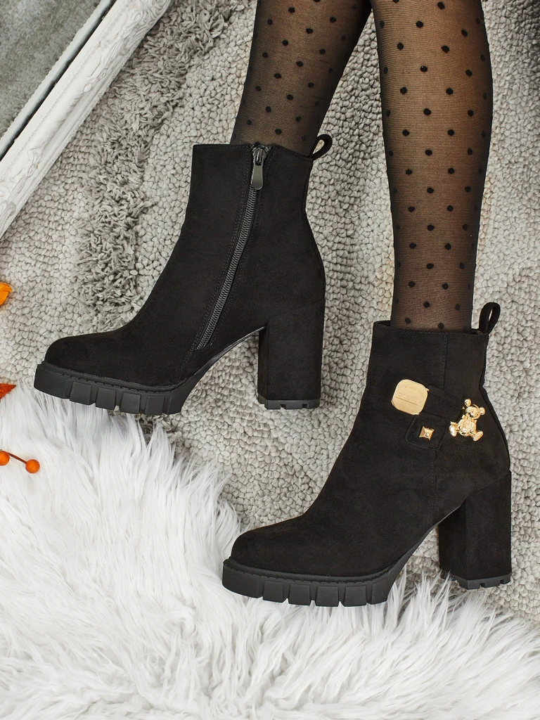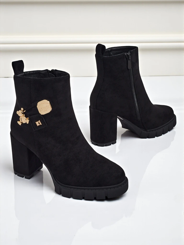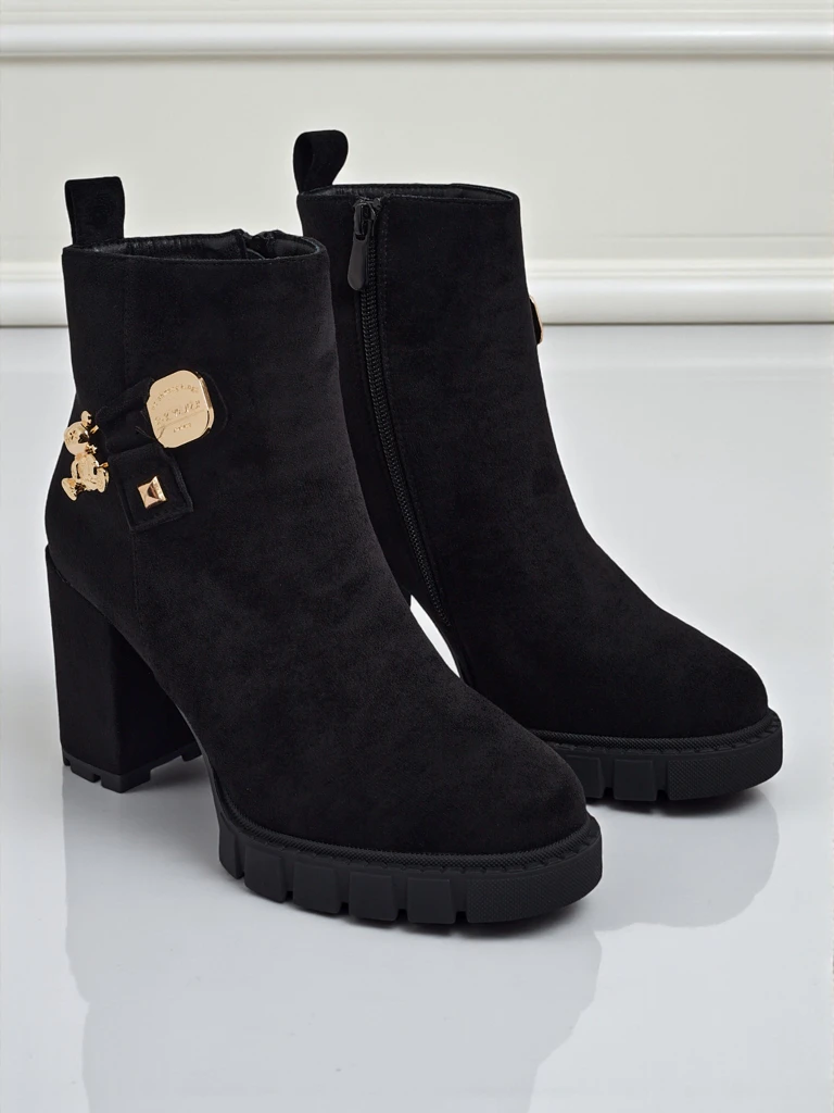 - Pohodlné kotníkové boty na sloupkovém podpatku, vyrobené z eko semišové kůže. Model se zapínáním na zip. Model je jemně zateplený kožíškem, má zlatou ozdobu na boku svršku. Ideální volba na podzim!