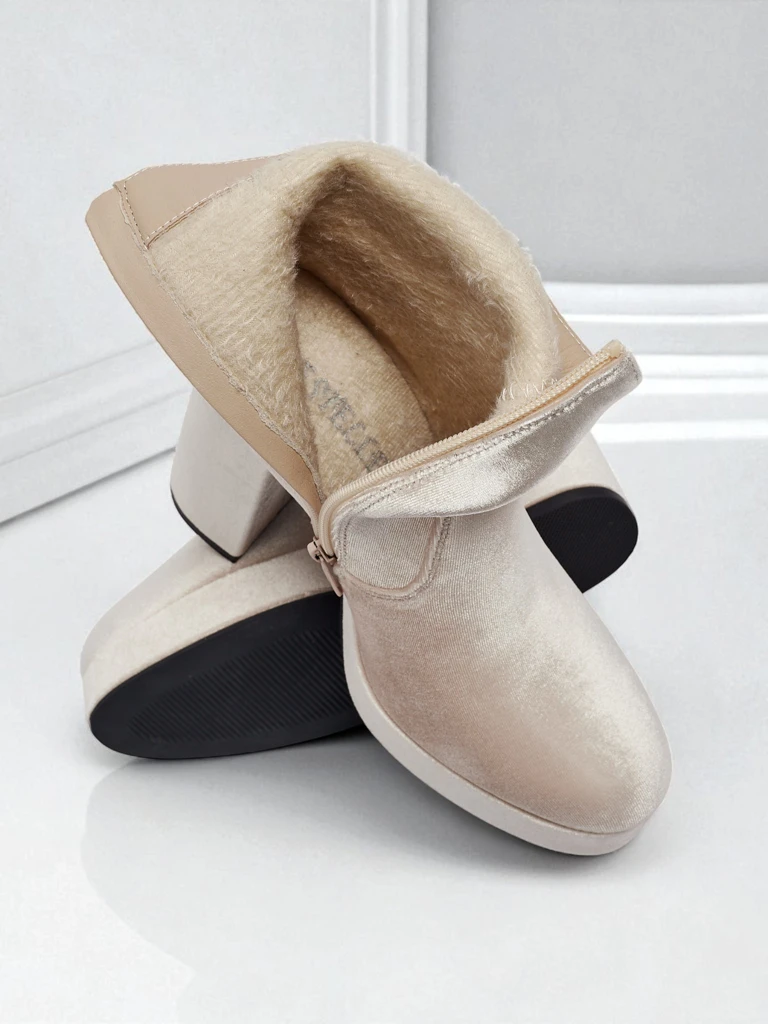 - Pohodlné kotníkové boty na sloupkovém podpatku, vyrobené z látky typu velur. Model se zapíná na zip. Mají jemné zateplení ve formě kožešiny. Ideální volba na podzim!