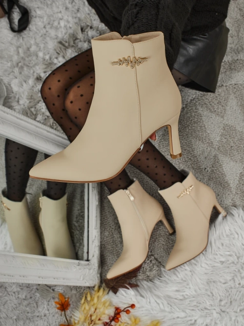 - Stylové dámské kotníkové boty z matné ekologické kůže jsou ideálním řešením pro chladnější dny. Model se zapíná na zip a je zateplený kožíškem. Model na jehlovém podpatku a se špičatou špičkou. Zdobeno prvkem zirkonů.