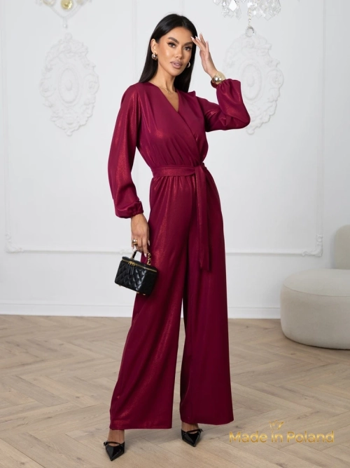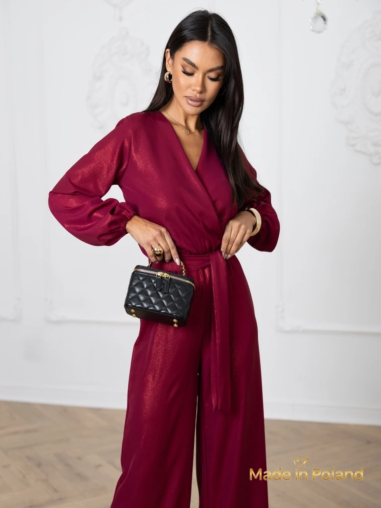 - Damski elegancki kombinezon wykonany z przyjemnej tkaniny z brokatową nicią. Góra z kopertowym dekoltem i długimi rękawami. Szerokie spodnie z gumą w talii. Dodatkowo pasek. Idealny dla tych, którzy cenią komfort.