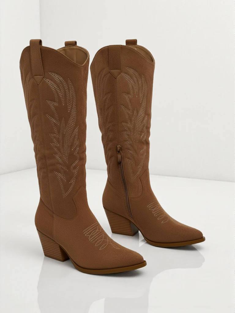 - Kovbojské kozačky na podpatku, vyrobené z ekologické semišové kůže. Obuv se zapíná na zip a má textilní výplň. Hodí se k mnoha dámským stylizacím!