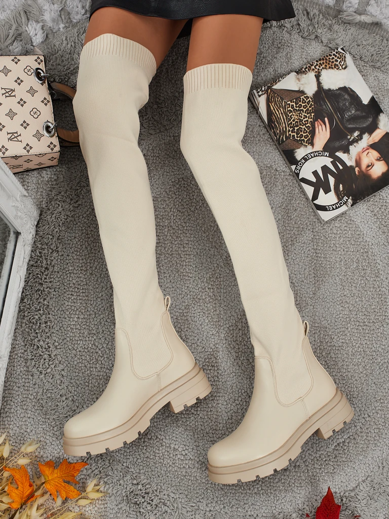 • Stylové dámské kozačky nad koleno na plochém podpatku. Svršek je vyroben z elastického textilního materiálu s vložkami z eko kůže, uvnitř textilní vložka. Nazouvací model. Ideální pro každodenní podzimní outfity!