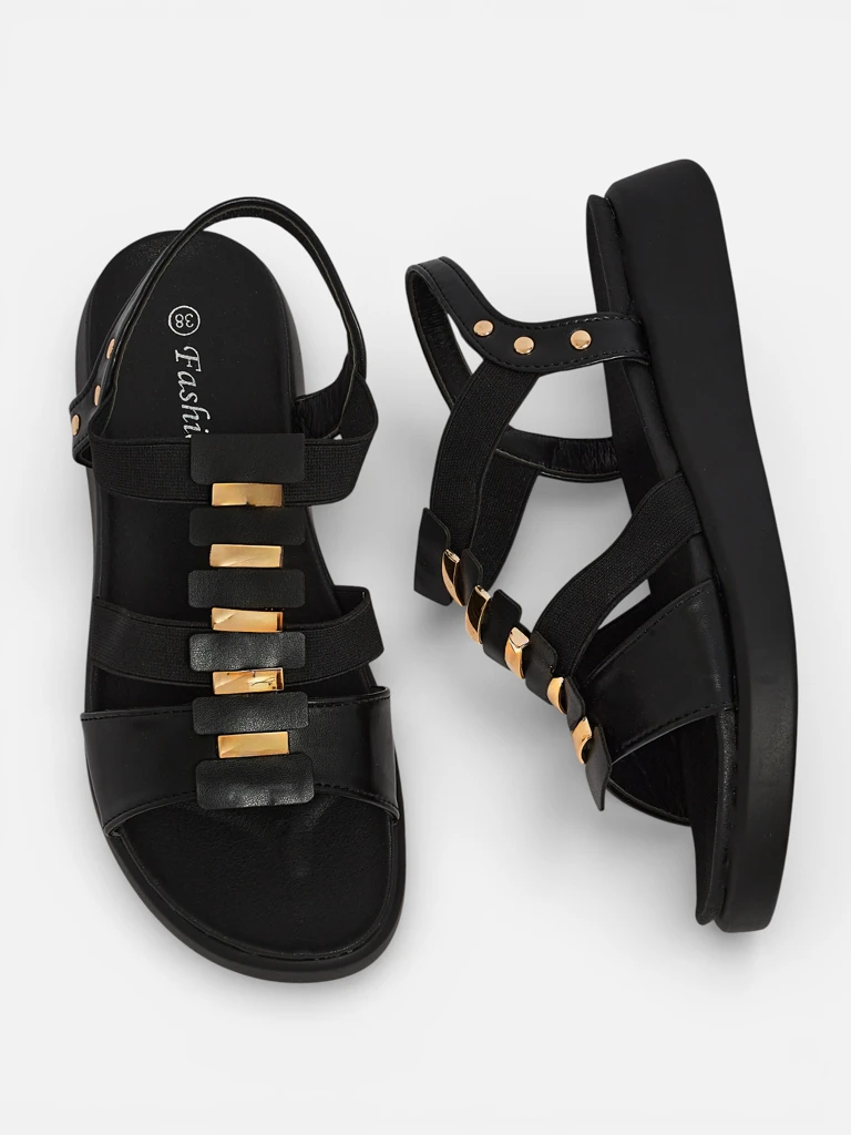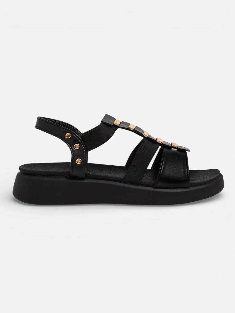 • Dámské sandály typu gladiátorky vyrobené z ekologické kůže a zdobené zlatým akcentem. Stylové a pohodlné – ideální pro letní, ženské stylizace s klasickým akcentem.