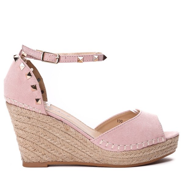- Rewelacyjne sandały na koturnie, z odkrytym noskiem. Obuwie wykonane ze skóry ekologicznej zamszowej. Ozdobione złotymi ćwiekami. Model bardzo wygodny i solidnie wykonany. Pasuje do wielu kobiecych stylizacji.