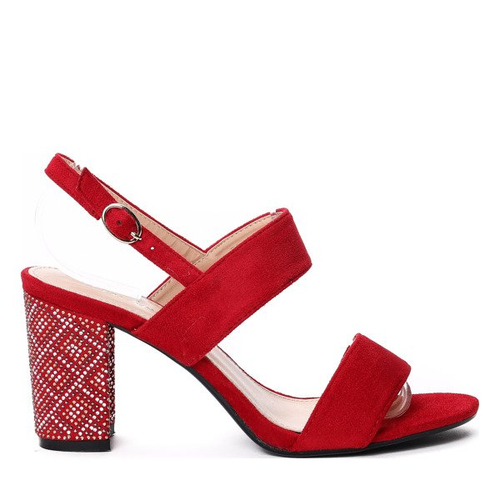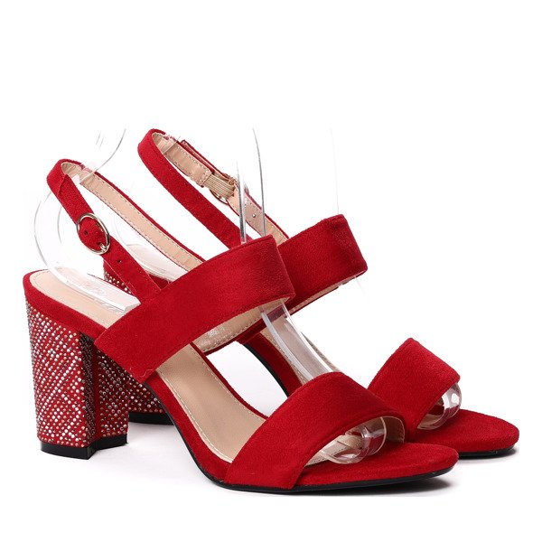 - Sandały na słupku wykonane z ekologicznego zamszu. Posiadają ozdobne cyrkonie, które znajdują się na obcasie. Zapinane na sprzączkę z boku. Sprawdzą się idealnie do każdej eleganckiej stylizacji.