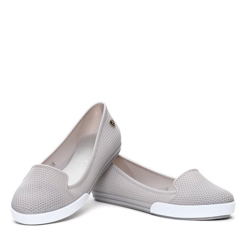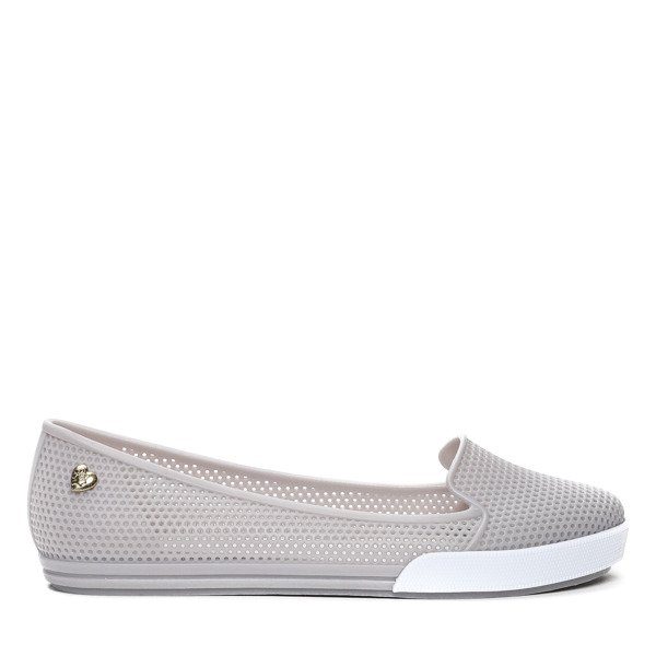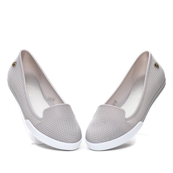 - Balerinki w stylu mokasyn z okrągłym noskiem ozdobione ze złotym serduszkiem. Cholewka wykonana z wysokiej jakości matowej, ażurowej gumy, której zaletą jest łatwość w konserwacji. Idealne na cieplejsze dni.