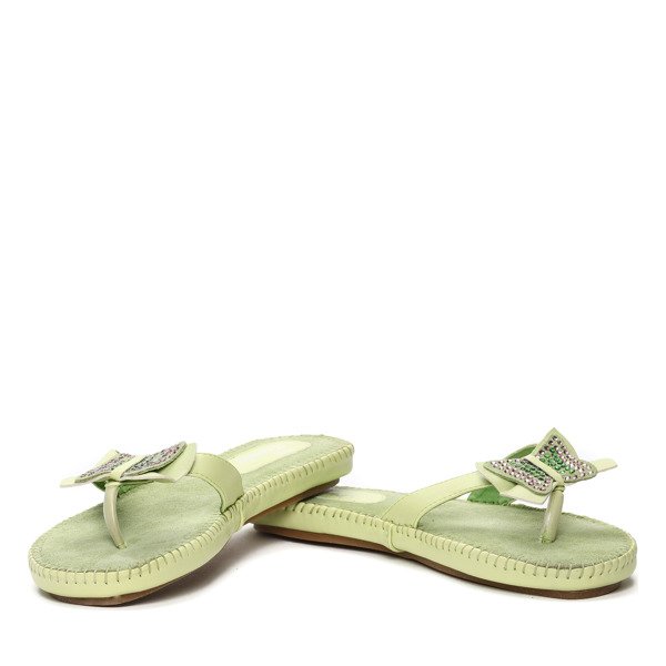 - Lekkie klapki japonki zdobione na przodzie kokardką z cyrkoniami. Obuwie wykonane z skóry ekologicznej, a podeszwa pokryta eko zamszem. Świetnie nadają się na plaże!