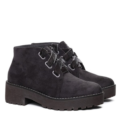 - Botki w najprostszym wydaniu, wykonane z miękkiego zamszu ekologicznego. Sznurówki z weluru. Wkładka pokryta ekologiczną skórą. Obuwie na 5 cm, płaskim obcasie. Solidnie wykonane i bardzo wygodne dzięki grubej podeszwie.