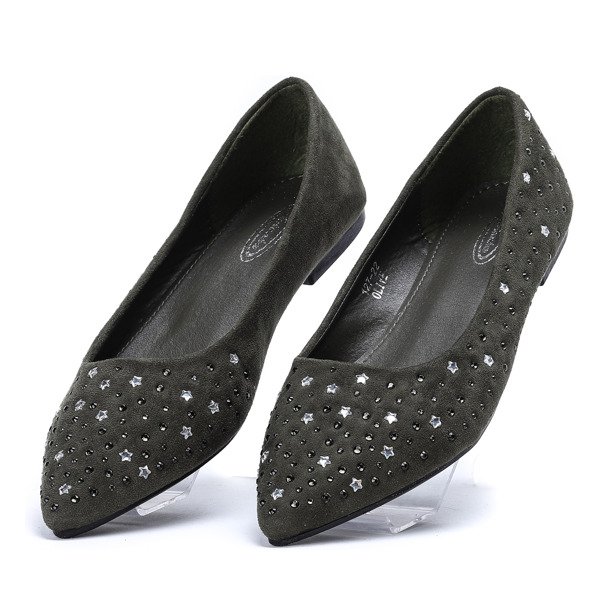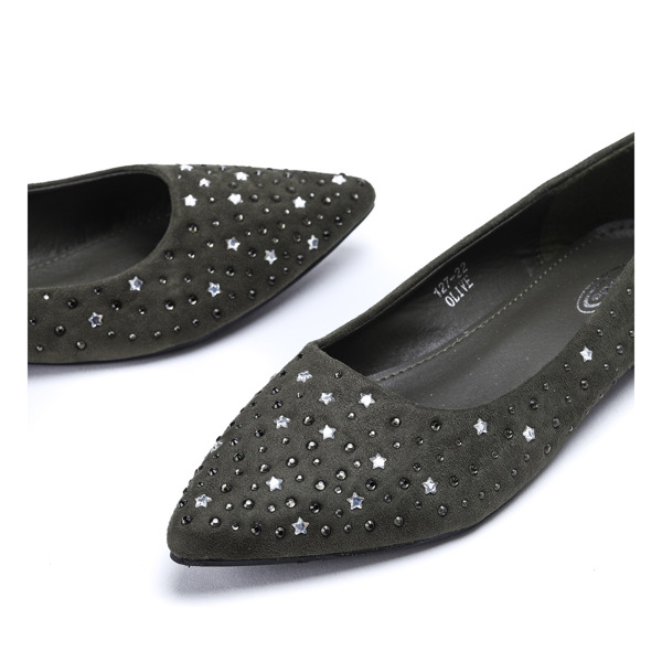 - Eleganckie baleriny ze spiczastym noskiem wykonane ze skóry ekologicznej zamszowej. Przednia część zdobiona dżetami oraz gwiazdeczkami. Będą świetnym dodatkiem na co dzień!
