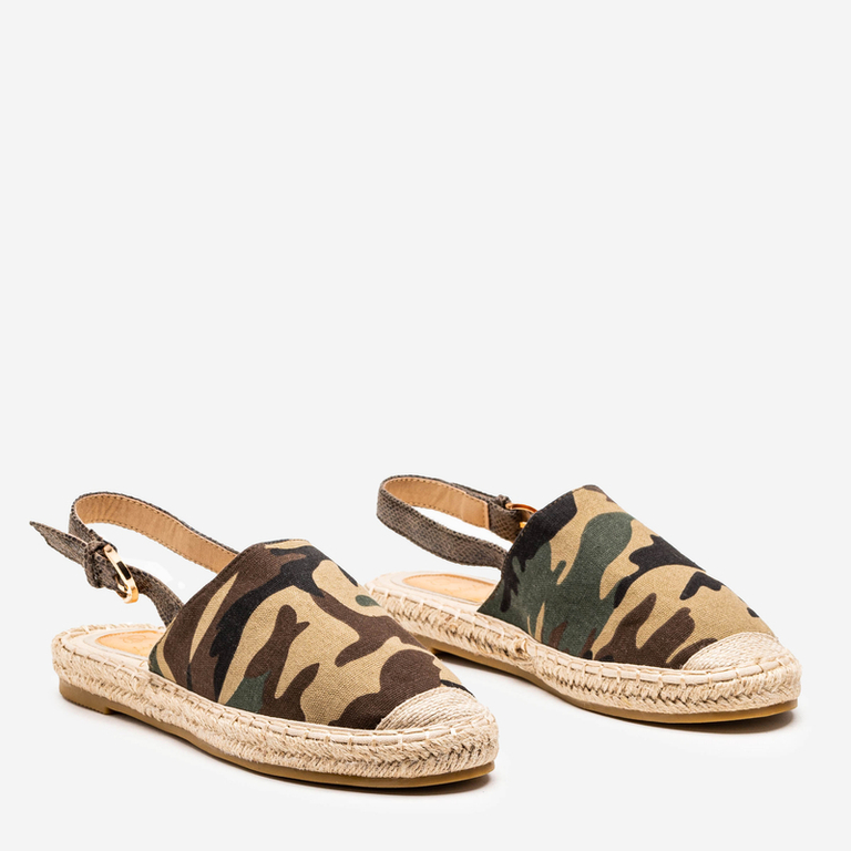 • Надзвичайно зручні еспадрільї з камуфляжної тканини. Смужка з екологічної замші, прикрашена тваринним мотивом. Тканина, покрита носком. Підошва та кінчик взуття оброблені плетеним джутовим шнуром.