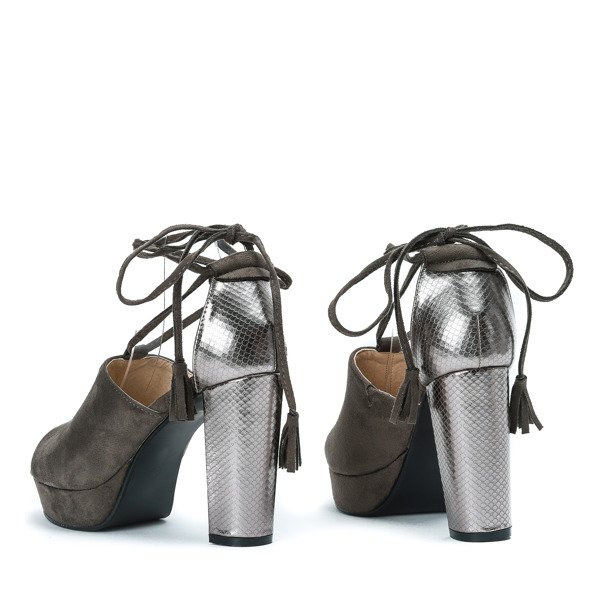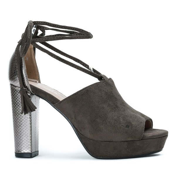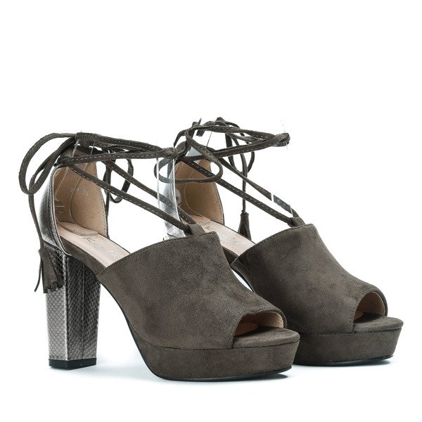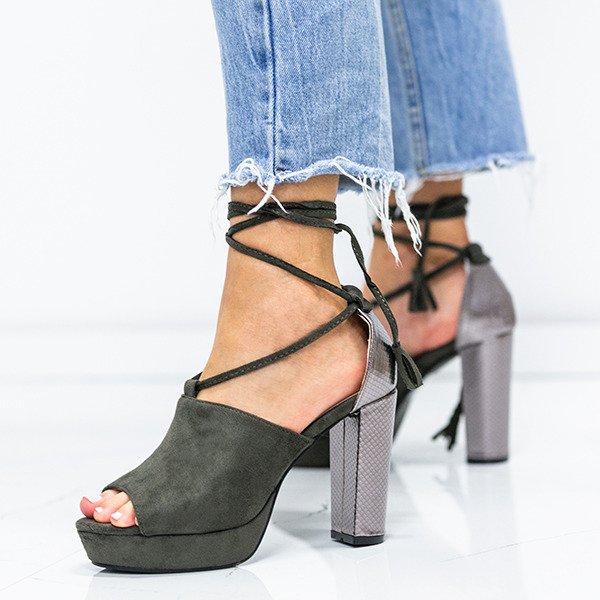 - Сенсаційні босоніжки на товстій поштовху з відкритими пальцями, представлені зеленим та срібним кольором. Верх виконаний з еко-замші та еко-шкіри, оброблений твариною