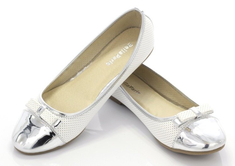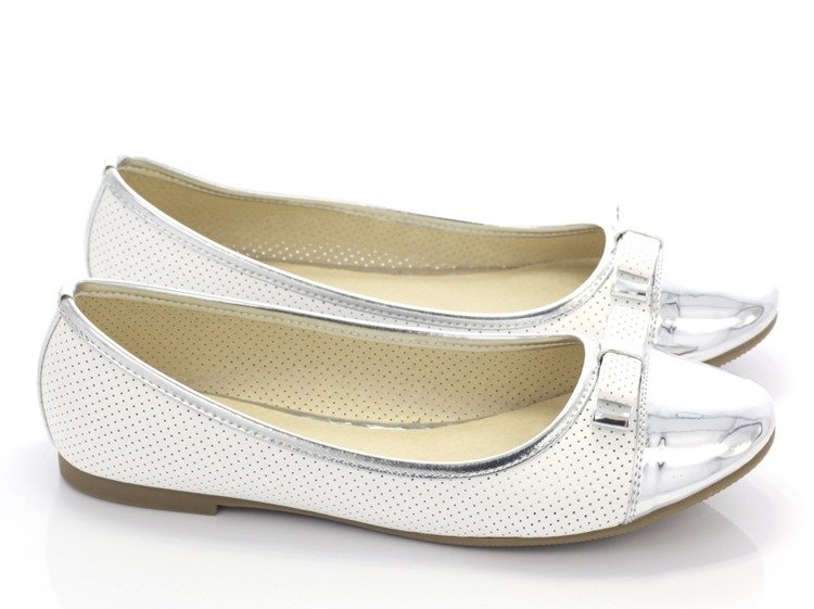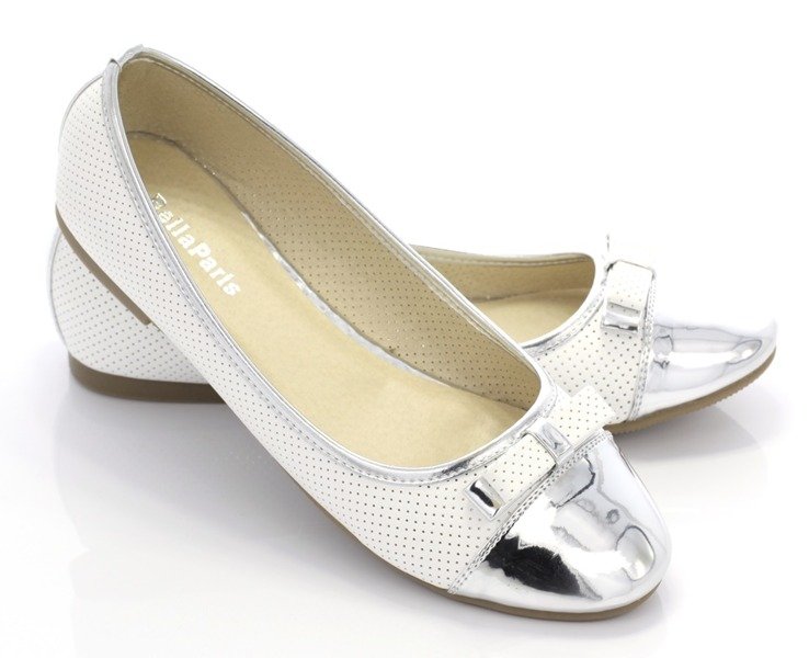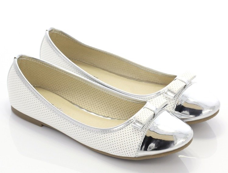 Biało-srebrne baleriny z kokardką - Obuwie