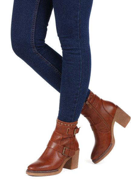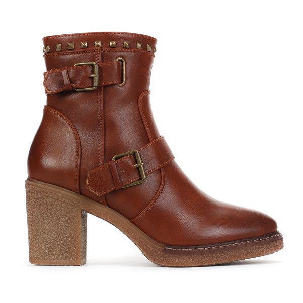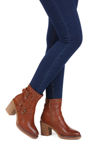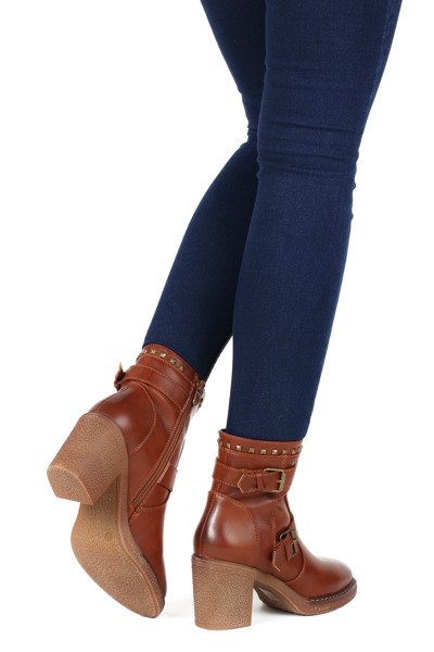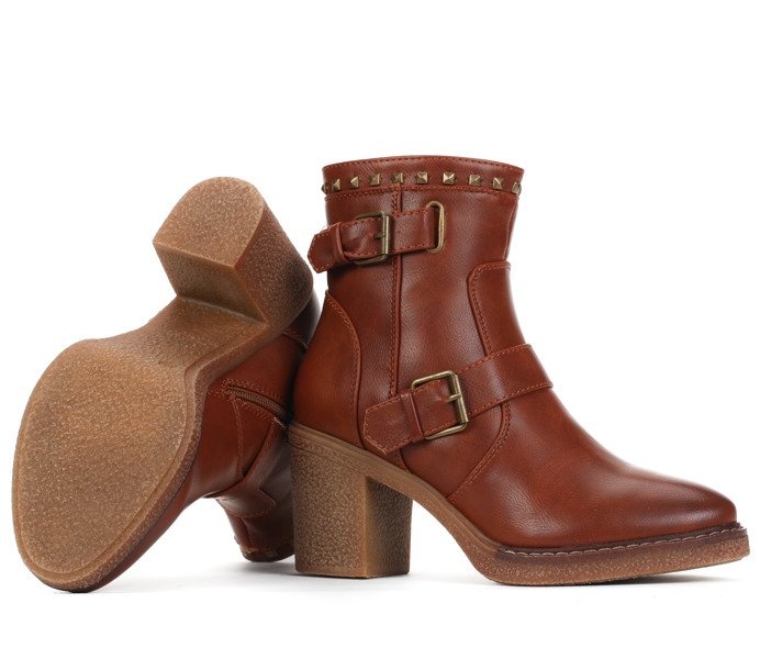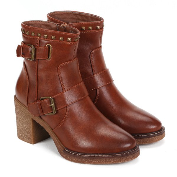 - Botki na słupku, wykonane ze skóry ekologicznej. Na cholewce znajdują się srebrne ćwieki. Buty zapinane zamkiem z boku, posiadają dwie ozdobne klamry. Doskonale prezentują się z jesiennym płaszczem oraz jeansami.