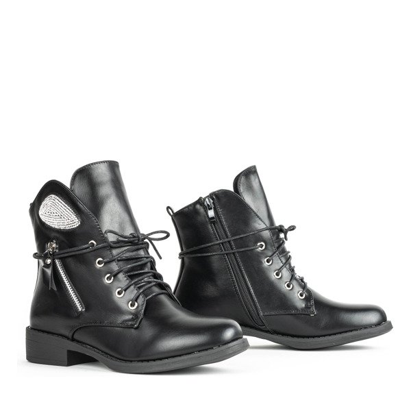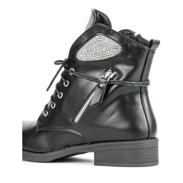 - Жіночі черевики на низькому плоскому каблуці з екошкіри. Модель в чорному кольорі. Утеплені всередині у вигляді хутра. Верх зав'язується шнурівкою, збоку декоративна блискавка. Робочі мають декоративні циркони у верхній частині.