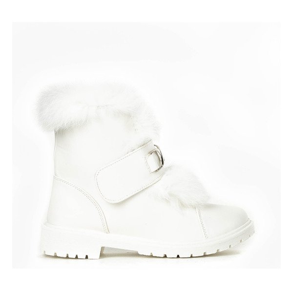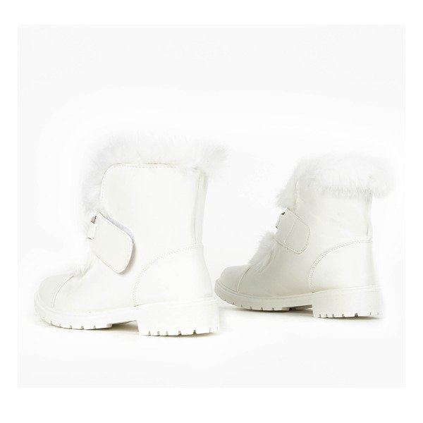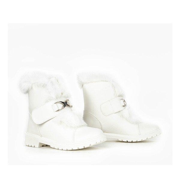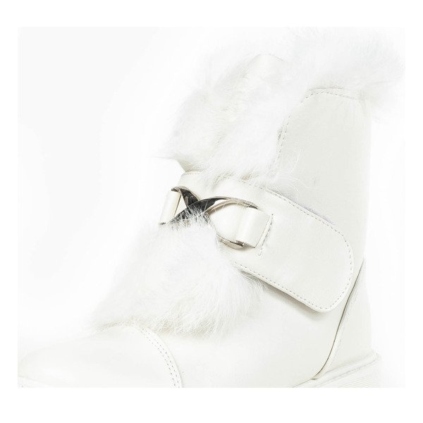 - Чарівні черевики для дівчат, утеплені хутром, з білої еко-шкіри. Представлене дитяче взуття має зручну застібку на липучках. Додатковою перевагою є підошва з козиркою