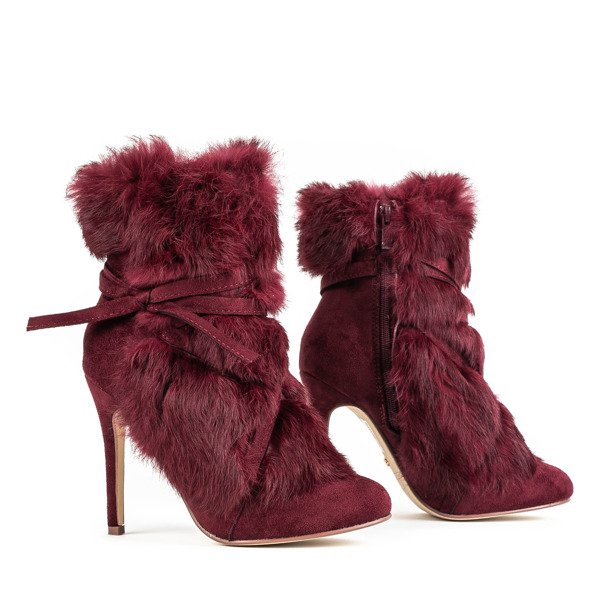 - Оригінальні жіночі напівчобітки на високому каблуці з екологічної замші в бордовому кольорі. Верх прикрашений м'яким штучним хутром. Модель має делікатне утеплення всередині. Збоку вони застібаються за допомогою блискавки.