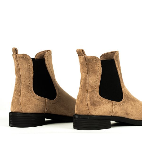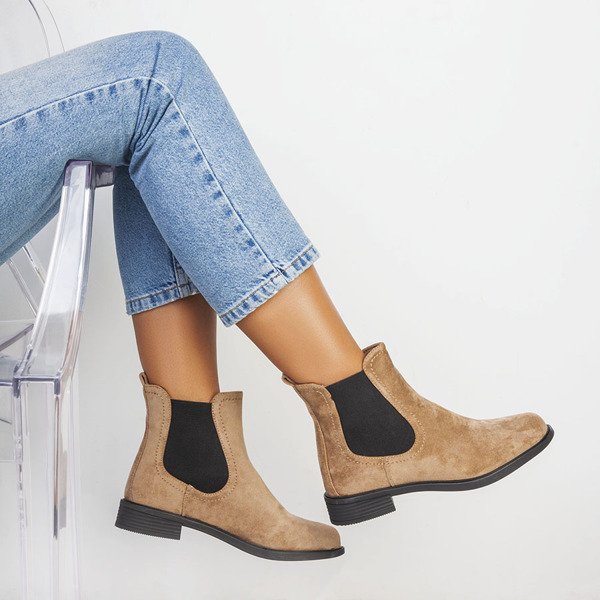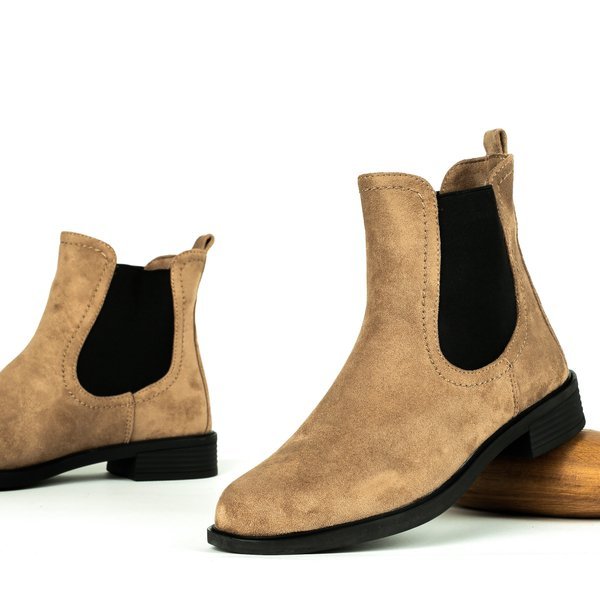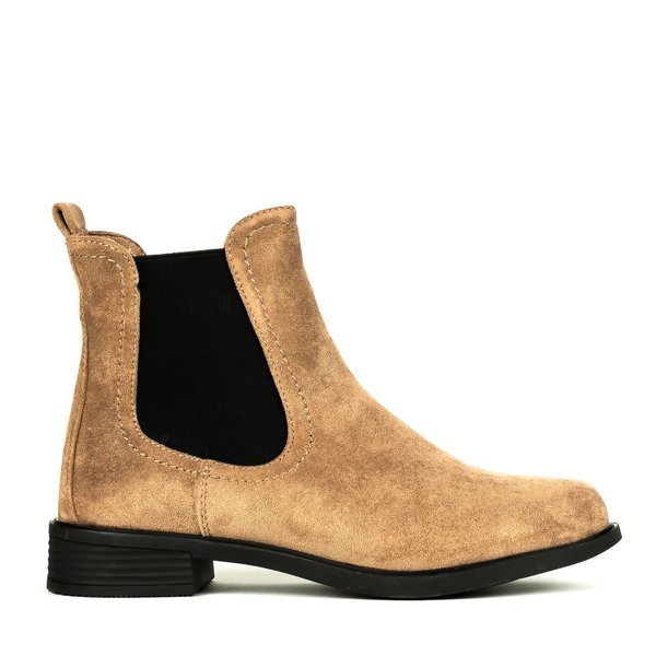- Класичні бежеві черевики на низьких підборах з екологічної замшевої шкіри. У верхній частині є вставки-резинки які дозволяють легко надягати взуття. Ідеально підходять для багатьох повсякденних стилів.