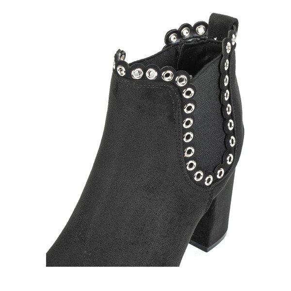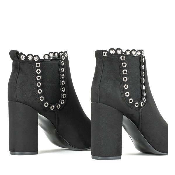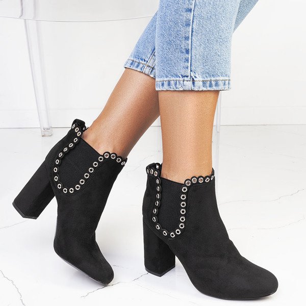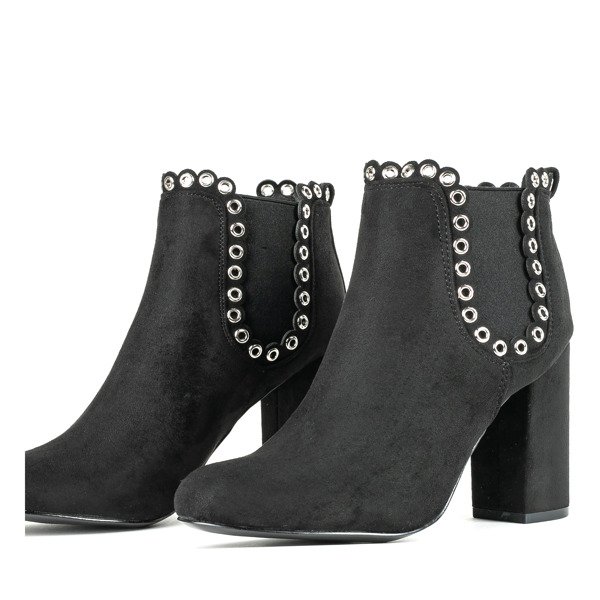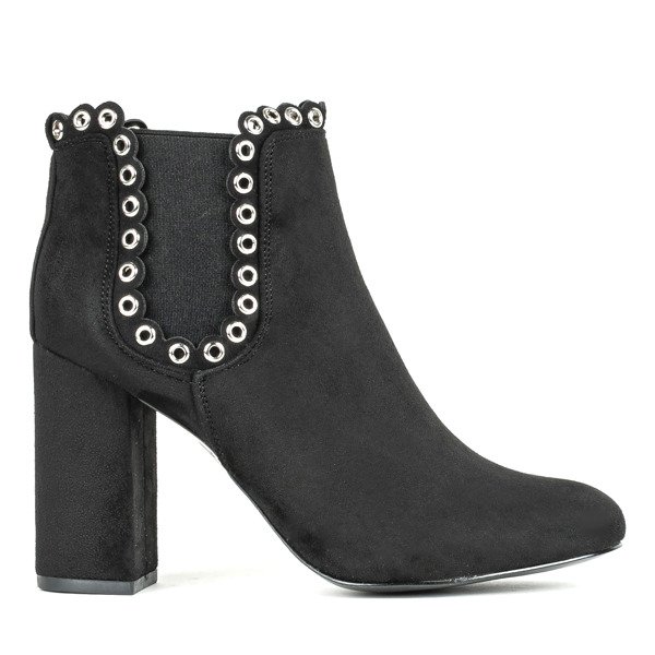 • Елегантні чорні чоботи на пості з екологічної замшевої шкіри. Модель, прикрашена срібними прокладками на верху. Шкіряні устілки. Жіноче взуття ковзання - вони не мають кріплення. Ідеально підходить для осені.