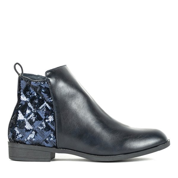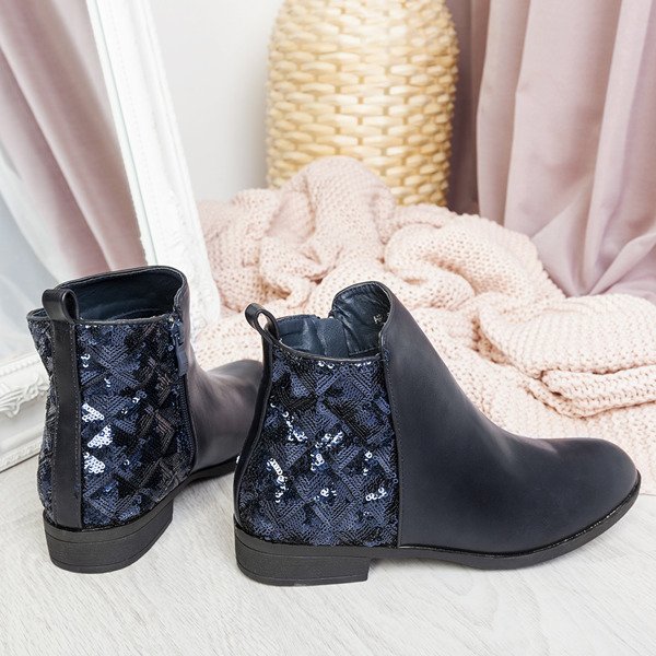 - Класичні черевики без підборів, виконані з еко-шкіри в темно синьому кольорі. Задня частина халявки прикрашена блискітками. Модель застібається на блискавку, яка розташовується збоку. Черевики ідеально підходять до щоденних стилізацій!
