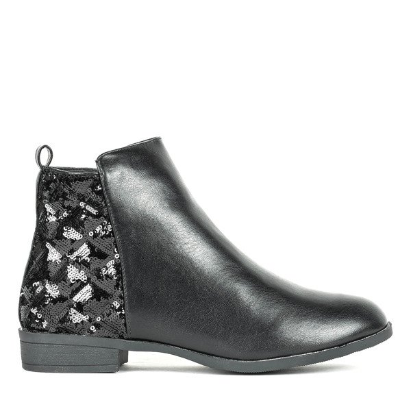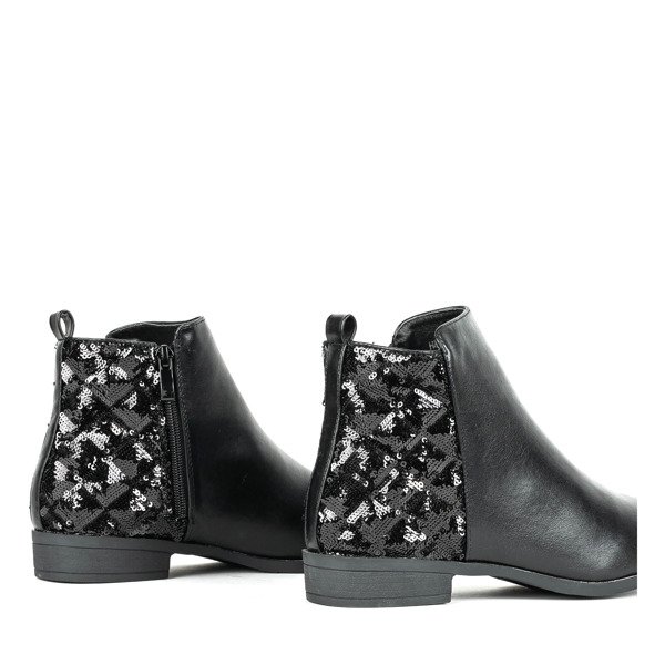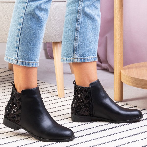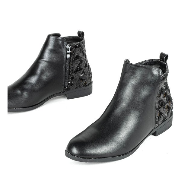 • Класичні черевики без підборів, виконані з еко-шкіри в чорному кольорі. Задня частина халявки прикрашена блискітками. Модель застібається на блискавку, яка розташовується збоку. Черевики ідеально підходять до щоденних стилізацій!