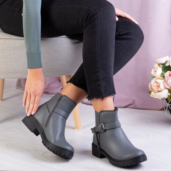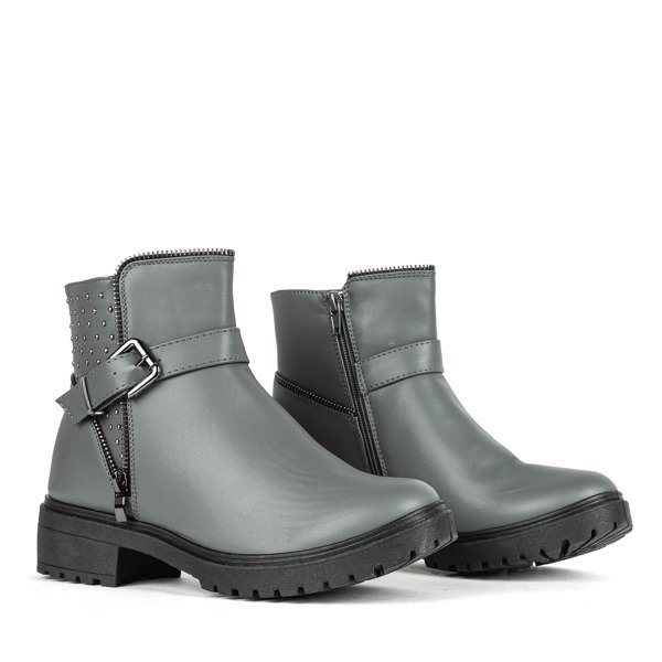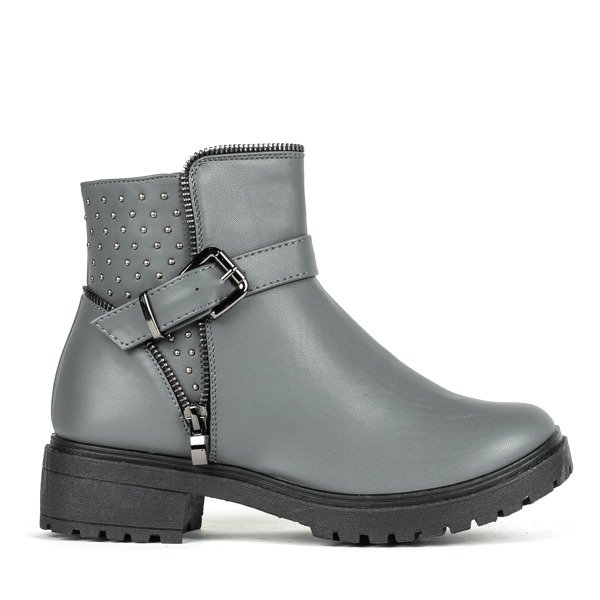 - Дівчачі черевики з екологічної шкіри сірого кольору. Модель застібається на блискавку збоку. Пряжка і крихітні струмені на верхній частині. Виріб не утеплено. Ідеально підходить для холодних днів.