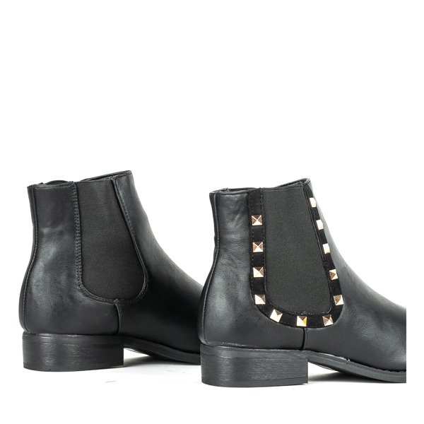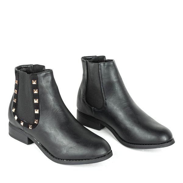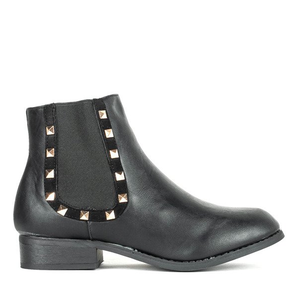 - Елегантні черевики на низьких підборах з чорної еко-шкіри. У верхній частині є вставки з еластичного матеріалу для полегшення надягання взуття. Жіноче взуття має прикраси у вигляді золотих заклепок. Модель злегка утеплена паролоном.