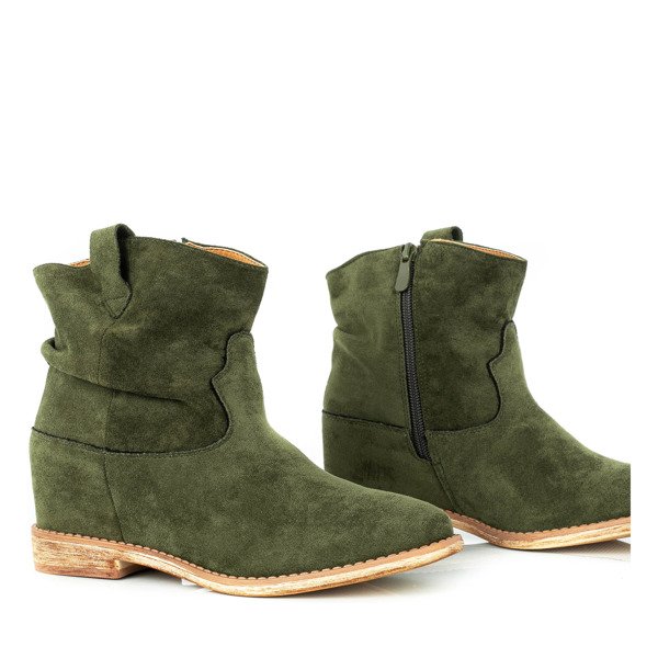 • Зелені ковбойські черевики ала з екологічної замшевої шкіри. Модель утеплена м’яким хутром всередині. Взуття на низькому, танкетці в приміщенні. Взуття застібається на блискавку. Ідеально підходить для холодних днів.