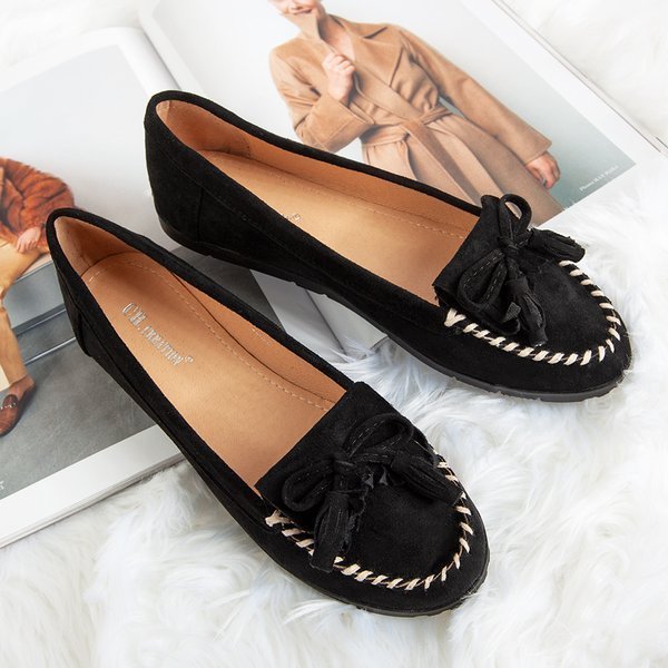 - Жіночі чорні мокасини на плоскій підошві. Матеріал виготовлений з екологічної шкіри замші. Верх прикрашений бантиком з бахромою і прошиті бежевими нитками. Устілка викладена еко-шкірою.