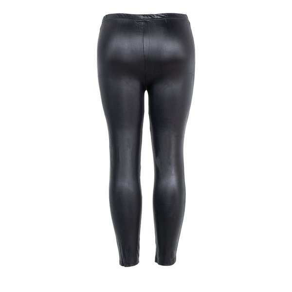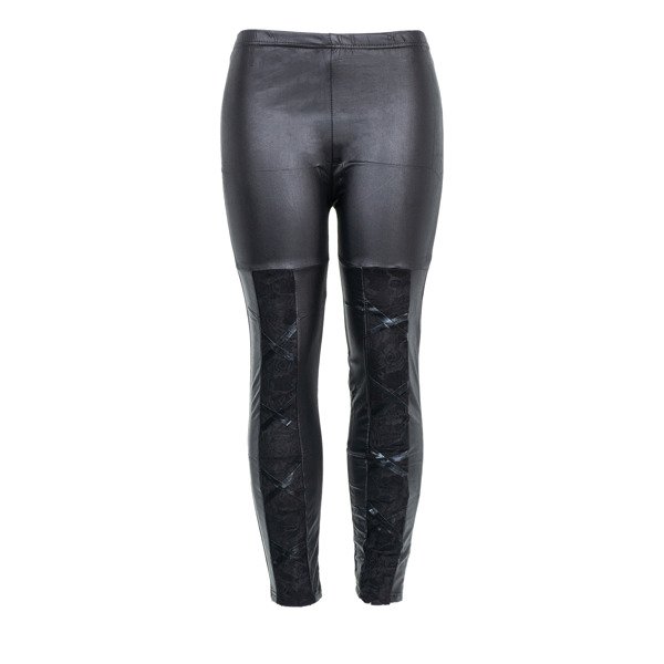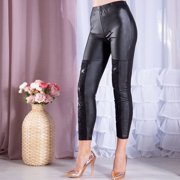 • Чорні класичні жіночі легінси. Матеріал - еко-шкіра. Халошні мають мереживні вставки спереду. Крій чудово підкреслює фігуру і оптично подовжує ноги.